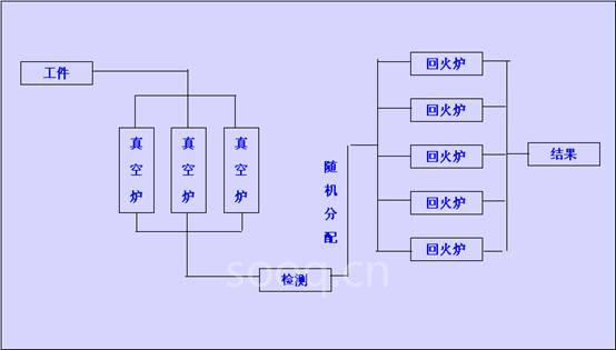 - 检测2:回火后的工件经过硬度计检测硬度,硬度是否合格,并将检测结果人工录入系统报表中,不论检测硬度是否合格都需要再次回火,至少三次,每次回火包括一次工件进回火炉的分配过程,一次人工硬度检测及检测结果的录入工作,经过三次回火后,工件合格,则加工全过程完成,工件不合格,则人工拿回去返工。