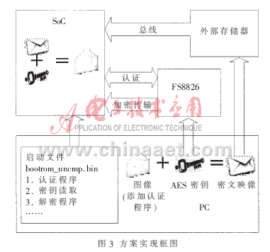 软件设计从两个主要方面考虑,一是代码加密,二是版权认证。前者主要通过AES(Advanced Encryptiong Standard)加解密算法实现,其算法密钥的管理以及版权认证将依靠FS8826来实现,最终达到安全启动嵌入式操作系统以及保护运行时的版权目的。安全启动方案基于Bootloader+Image的加载机制,也是ARM处理器通用的引导机制。首先采用AES加解密算法在PC机端将编译完成Image加密,利用FS8826安全存储区存放AES算法密钥,密文存储在片外存储器中,ARM启动时将密文加载入内存。然后在Bootloader启动过程时加入与FS8826的认证操作,认证通过则在该过程中使用AES解密算法解密Image,并用明文将原内存中的密文覆盖,系统正常运行中加入与FS8826的实时通信监测,确保在授权目标机上运行程序。软件实现流程如图2所示,相应的方案实现框图如图3所示。