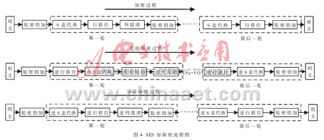 AES是美国国家标准和技术研究所(NIST)选定的高级加密标准,是目前对称加密领域内的主流算法。其数据分组固定为128 bit,密钥分组可支持128 bit/192 bit/256 bit。核心过程为数据块矩阵的Nr(10/12/14)次轮操作。每一次轮操作都由S盒代换(SubBytes)、行移位(ShiftRows)、列混淆(MixColumns)和轮密钥加(AddRoundKey)4个函数组成,第Nr次轮操作不包含MixColumns 函数。密钥扩展为每一轮变换提供轮密钥[2]。本方案中加密在PC机端离线完成,没有时间和运行效率的特别要求,但是解密在ARM9处理器中完成,其运行时间将作为系统启动的一部分,所以下面针对解密部分的算法程序结合其实现平台进行优化设计。