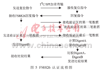 FS8826芯片自带24 B硬件密钥,具有不可回读、不可在总线上传输的特点,主要用于芯片内部的认证模块运算(HASH&3DES)和安全数据传输。芯片内部开辟了1块安全存储区(96 B EEPROM),读写都受硬件密钥的保护,且具有CRC校验功能。在本方案中该芯片主要实现两方面功能: SoC版权确认和AES密钥管理。前者通过认证实现,具体流程如图5 所示。总线上发送的数据为硬件密钥与用户设置的认证区数据通过HASH运算得出的数组,并加入了8 B随机数,能够有效地防止重放攻击(reply attack)。该项功能能够提供代码完整性验证[4],在一定程度上抵抗反汇编攻击。后者通过将AES密钥烧入FS8826的安全存储区,由其硬件密钥进行保护实现,认证通过后发送加密的读取命令,算法密钥以密文形式在总线上传递[4]。