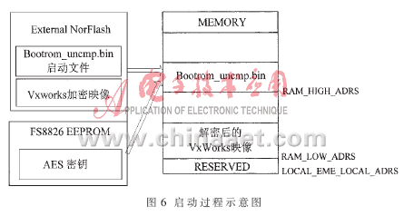 VxWorks操作系统的映像包括两大类:VxWorks类型和Boorom类型[5]。本文对RAM中运行的VxWorks映像在PC机端进行AES加密。选择执行格式的未压缩Bootrom映像——bootrom_uncmp作为启动映像,并在其调用的初始化文件(bootConfig.c)中加入与FS8826的安全认证、密钥传输以及解密运算。bootrom_uncmp由仿真器烧入到目标板的norflash中,上电后,bootrom_uncmp把自身拷贝到RAM_HIGH_ADRS地址上运行引导程序。之后,把VxWorks映像装入到起始地址为RAM_LOW_ ADRS的RAM 中,接着跳转到VxWorks映像装入点运行[5]。如果认证通过,引导程序将从FS8826的安全存储区获取AES算法密钥,进行解密,否则在RAM_LOW_ADRS处的VxWorks映像将仍然为密文,无法正常启动。如图6所示。