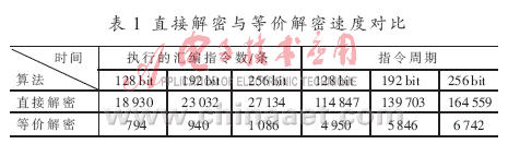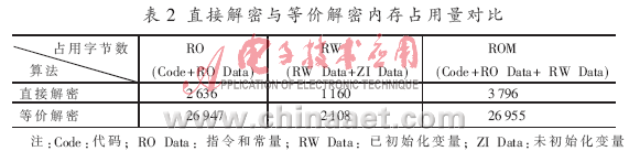 按照ARM平台下的优化原则,AES解密算法通过直接解密和等价解密2种形式进行实现,并通过ADS的Debugger Internals工具从速度和内存占用量两方面衡量实现效率[2]。如表1所示为在ARM9处理器中2种算法所耗的汇编指令数和指令周期数。表 2为两者占用的内存资源对比。