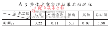 需要注意的是,在启动过程中只开启了指令cache,且没有MMU的支持,所以解密的执行速度较之系统启动后要慢很多。经测试,在系统加载起来后1 MB的密文解密操作只需1.7 s。对启动速度有特殊要求的应用可以对MMU和cache的使用进行进一步的调整设计。