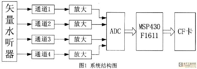 系统对采集的数据只存储而不做信号处理,在处理器的选取上也就不必一味追求高速度,本系统采用TI公司的超低功耗单片机MSP430F1611作为系统的处理器,负责AD的采集,并把采集的数据写入CF卡。这是一款高性价比的单片机,具有以下特点:丰富的片内外设;超低功耗,在电压3.3V主频1MHz时工作电流仅600μA;强大的处理能力,在8MHz晶体驱动下,指令周期为125ns,完全满足系统的处理需求。系统总的结构图如图1所示。