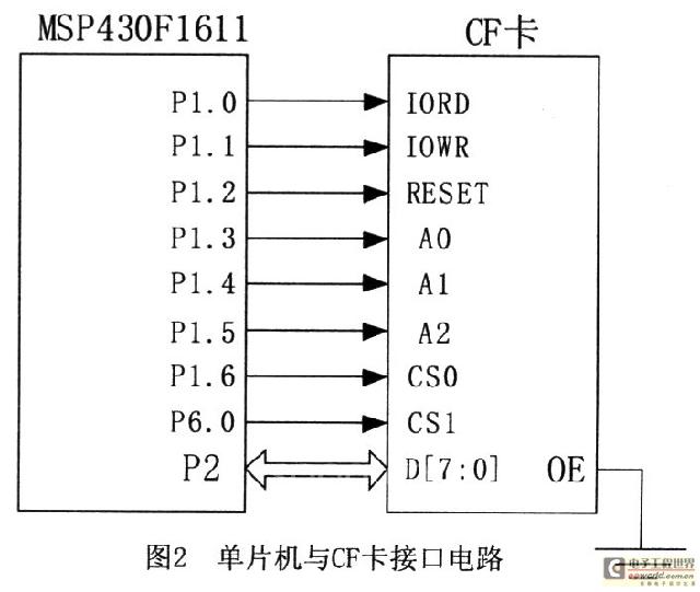 MSP430F1611拥有六个可独立配置的双向8位I/O端口(P1~P6)。本文的设计中将P1端口的P1.0、P1.1引脚分别与CF卡的读写信号线IORD、IOWR相连;复位信号RESET由P1.2给出;A0~A2为数据、命令或状态寄存器地址线,由单片机P1.3~P1.5管脚控制。CF卡总共有16根数据线D[15:0],但可以通过软件设定其工作在16 bit模式还是8 bit模式,由于MSP430F161l单片机数据线宽为8位,硬件中设计其工作在8 bit模式,使用D0~D7为数据线,与单片机的P2端口相连,D8~D15悬空。