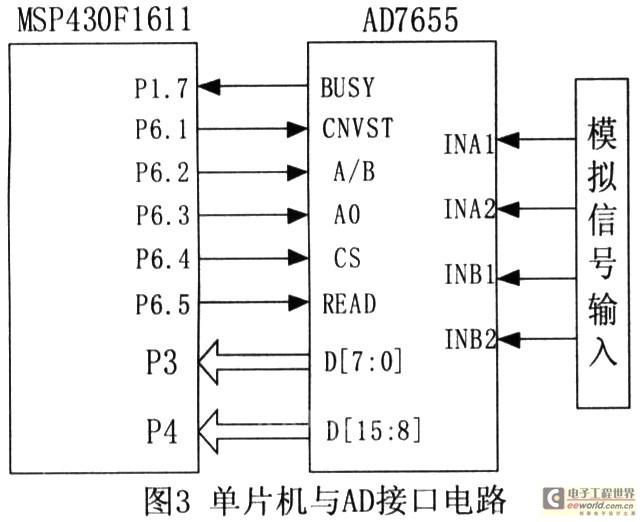 为了降低系统功耗,在我们系统指标要求的前提下,ADC器件的选取尽量选用低功耗ADC器件。设计中我们采用了美国ADI公司的AD7655,这款ADC采样率在10kSPS时功耗仅2.6mW,有四个模拟输入通道,精度为16bit,最高采样率高达1MSPS。数据输出接口支持串行和并行两种方式,可以方便地与单片机、DSP等处理器实现无缝连接。具体的AD与单片机的硬件接口图如图3所示。