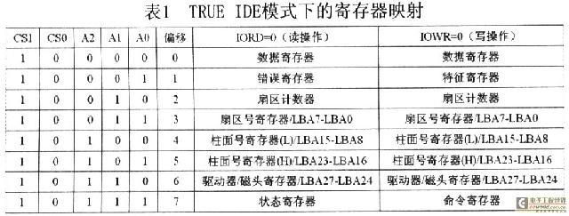 CF卡的读写是以扇区(sector)为单位的,每次读写一个或连续的多个扇区,每个扇区大小为512字节。对CF卡的读写访问操作都是通过访问其内部寄存器来实现的,对不同的寄存器进行访问是靠上节所提到的A0~A2、CSO、CSl这五根数据线来译码的,在本文的设计中,CF卡配置成TRUE IDE工作模式,具体的寄存器映射如表1所示。