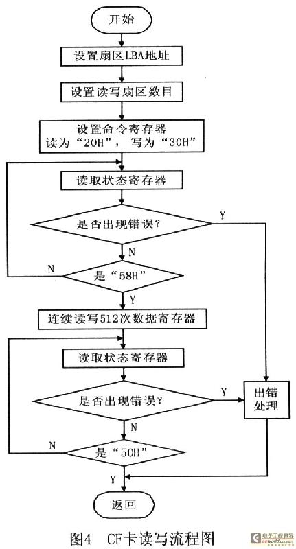 读写扇区时,首先需要设置起始扇区的LBA地址和扇区数目,并设置命令寄存器,读取数据设置命令“20H”,写入数据设置命令“30H”。然后读取状态寄存器,判断状态寄存器是否为“58H”。若为是,则开始读写操作;若为否则继续读取状态寄存器。接下来读状态寄存器是否为“50H”,判断CF卡操作是否完成。若为否,则继续读取判断;若为是,则结束读写过程。如果在判断状态寄存器中发生了超时或出现错误,则设置超时或错误标志,并跳出读写过程。图4为CF卡读写一个扇区的流程图。