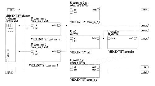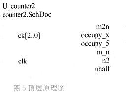 本设计使用第三方EDA开发工具Protel DXP。该开发工具支持层次原理图及VHDL语言混合设计并能进行编译、时序和功能仿真,支持Xilinx、Altera、Lattice等公司的系列 CPLD/FPGA器件,并且具有设计直观、层次性好等优点。在设计中采用两级原理图和底层VHDL语言三级结构来实现,使整个的设计以功能模块化,便于程序修改、功能升级和分频系数的设定。对于分频值的设定采取了软件设定的方法,即只需在VHDL语言程序中按照自己的需求对相应的参数作修改、设定,而且设定值的取值灵活。顶层原理图、次级原理图分别如图5、6。