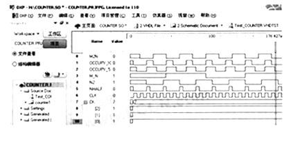 本次设计CK延时3ns后设值为111,即功能模块全部选中工作;偶数倍分频模块中模N计数器N设置为2,实现四分频;奇数倍分频模块中模2N+1计数器 N设置为1实现三分频,占空比X设置为1即分频系数为1/3,模M计数器M值设置为2实现2M*(2N+1)=12分频;N-0.5倍分频模块中N设置为 3,实现2.5分频。从方针波形中可以看出,实现了通用多功能分频器。若要得到其他值,只需修改相应功能模块的VHDL语言中的相关的参数,再进行编译、综合适配、下载即可。