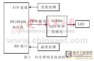 汽车照明系统的主要功能是可根据环境温度和亮度自适应调节LED的亮度。本系统采用PIC18F448单片机作为LED控制中心,利用其中1个10位A/D转换通道接收亮度信号,RB口接收温度检测信号,并根据亮度和温度通过CCP模块输出不同占空比的PWM脉冲至XLT604 LED驱动器的PWM引脚,从而实时调节LED的输出光通量,即调节LED的亮度。系统整体结构图如图1所示。