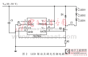 在汽车照明系统中,LED驱动电路必须能够从汽车电源总线中获取工作电源。在应用中,为获取所需亮度的照明光源,可采用单个高功率的LED或者多个LED串联、并联或串并混合连接的结构。由于汽车电源总线提供的标称值为12 V,因此系统选用输入电压为7~450 V的大功率LED驱动芯片XLT604。XLT604是采用BICMOS工艺设计的PWM高效LED驱动控制芯片,能以300 kHz的固定频率驱动外部MOSFET,且其频率可由外部电阻编程决定;外部高亮度LED串可采用恒流方式控制,以保持恒定高亮度并增强LED的可靠性,其恒流值可由外部取样电阻决定,其变化范围从几mA~1 A。XLT604驱动的LED可以通过外部控制电压线性调节其亮度,也可通过外部低频PWM方式调节LED串的亮度。在汽车照明系统中,一般只需输出光通量范围在150~800 lm。系统采用Cree公司的XLamp XP-E LED,可达到100 lm/W的发光效率,并且采用3个LED串联的结构[2]。LED驱动及调光电路如图2所示。