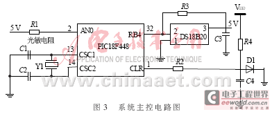 PIC18F448单片机是系统的主控中心,内部包含4个定时器、4个I/O端口、8通道10位A/D转换器、2路PWM脉冲输出、SPI总线接口等,资源比较丰富,能满足系统的设计要求[1]。系统主控电路如图3所示。其中,PIC18F448 的RA端口的AN0引脚接收来自光敏传感器的光亮检测信号,RB4端口接收DS18B20温度检测信号,并且系统根据这2个变量输出不同占空比的PWM脉冲至XLT604驱动器的PWM引脚,从而调节LED的输出光通量。