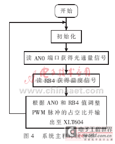 系统上电后首先初始化PIC18F448,并读取其光通量的检测信号和温度信号,然后调整输出PWM脉冲的占空比并发送至LXT604的PWM引脚,循环往复,从而达到动态调光的目的。根据光通量和温度信号值动态调整PWM输出脉冲的占空比是系统软件设计中的关键内容。操作PIC18F448内部的寄存器可调整输出PWM脉冲的占空比,其实现步骤如下:(1)初始化CCP1模块控制寄存器CCP1CON的低4位为11XX,并将TRISC.2位清零,使CCP1模块工作在PWM脉冲输出模式下,可输出分辨率达10位的PWN脉冲;(2)写定时器TMR2的8位周期寄存器PR2,设置PWM输出脉冲的周期;(3)写定时器TMR2的控制寄存器T2CON,使能定时器TMR2并初始化TMR2的前分频值;(4)CCP1模块包含2个8位寄存器CCPR1H(高字节)和CCPR1L(低字节),通过写入CCP1CON控制器CCPR1L寄存器的4、5位可得到PWM脉冲的高电平时间,可在任意时刻写入,但仅当定时器TMR2的增量计数值与周期寄存器PR2的值相等时,数据才真正写入到CCPR1H寄存器内部。其中PWM脉冲周期=[(PR2)+1]×4×Tosc×(TMR2前分频值),PWM高电平时间=(CCPR1L:CCP1CON[5:4])×Tosc×(TMR2前分频值),PWM输出占空比=(CCPR1L:CCP1CON[5:4])/(PR2+1)×4