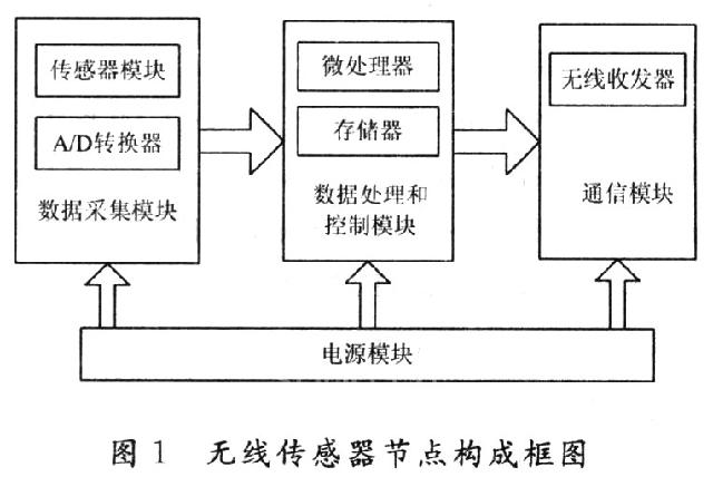 无线传感器网络节点主要由传感器模块、处理器模块、无线收发模块、电源模块构成,如图1所示。