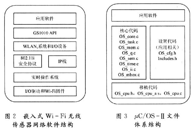 μC/OS-Ⅱ的前身是μC/OS,它是一种免费公开源代码的实时操作系统,具有执行效率高,占用空间小,实时性能优良和可扩展性强等特点。它包含了任务调度、任务管理、时间管理、内存管理和任务间的通信和同步等基本功能。这里的无线传感器网络的软件设计包括:无线功能(802.11)、GS1010 APIs、电源优化管理、网络管理、系统管理和配置、I/O的服务和驱动程序、安全等,如图2所示。
