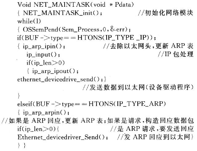 图4是嵌入式Wi-Fi的软件结构。将通信的实现分为三个任务:分别是网络任务(NET_MAINTASK)、数据包接收任务(ETH_REPOLL_TASK)和周期时钟任务(PERIO_TASK)。这三个任务之间相互协调完成数据从链路层到应用层或应用层到链路层的传递。网络任务优先级在所有通信任务中优先级最高,当它完成网络各部分初始化工作后,就负责对新近接收到的数据进行处理并向应用层分发。刚开始它会挂起自己,当接收到数据包收发任务发送的信号后转入运行状态。