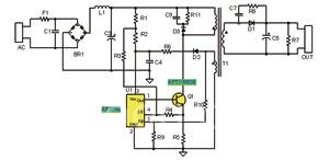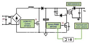 IEC国际电工委员会对照明灯具提出明确的谐波要求,即IEC61000-3-2标准。因此对于较大功率LED照明应用,采用功率因数校正(PFC)控制技术成为必需。对于60W以下应用,有高性价比单级PFC控制方案,该方案电路原理图如图6所示。