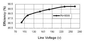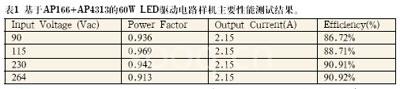 该电路采用Boost PFC+Flyback两级拓扑结构,控制芯片采用PFC控制芯片AP1661,PWM控制芯片AP3102和副边恒流控制芯片AP4310。该电路方案优点是输入/输出电容小,输出纹波小,隔离输出,功率因数高,电流精度控制在2%以内,可靠性高。图10为该方案的90W应用电路样机实物照片。图11为应用该方案大功率LED路灯灯具照片。图12为90W样机满载效率测试结果。