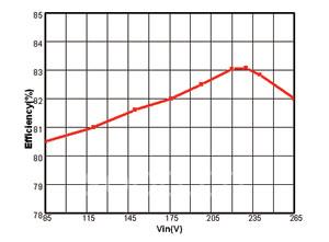 图2为该方案的5W应用电路样机实物照片。图3是基于AP3766的5W LED驱动装置实物照片。图4为基于AP3766的5W LED驱动电路满载效率随交流输入电压变化曲线。图5为基于AP3766的5W LED驱动电路满载输出IV特性曲线。