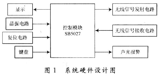根据产品性价比和实际需要,选用中易电测研究所研制的智能化超声波测距集成电路芯片SB5027,它采用CMOS制造工艺,片内具有比较器,标准40 kHz超声波发生器以及回波响应脉冲接收器,集有动态数码显示信息输出、操作键盘、数据存储、参数设定等功能。将SB5027用作距离检测时有以下特点:动态数码跟踪显示;可以对距离上限、中限、下限值等参数设定;可以对距离、时间、定时等报警允许参数设置;最大量程及最小分辨率均由用户设置;支持增值测距功能。系统硬件结构设计如图1所示。系统由超声波发射电路、超声波接收电路、键盘显示电路、核心功能芯片,辅助电路(复位电路和晶振电路)及报警电路等组成。