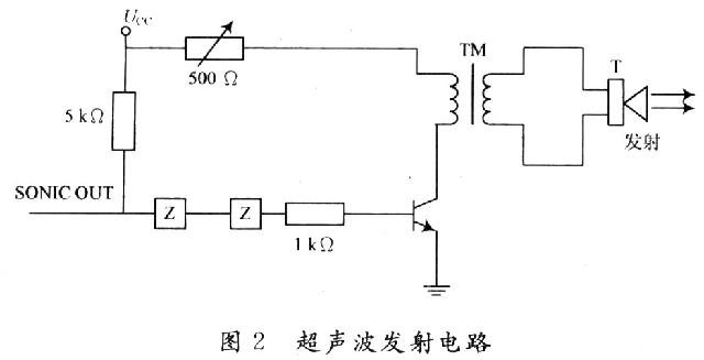 汽车防碰撞报警检测,采用超声波传感器。超声波传感器由超声波发射电路和超声波接收电路组成。超声波发射电路由施密特触发器、变压器、发射传感器T探头组成。由于SB5027内部有标准40 kHz的超声波发生器,所以直接引其内部信号(由引脚SONICOUT引出),但是该信号较弱,在发射电路部分还必须将信号放大。此信号经过两个施密特反向触发器串接,同时通过分压电阻使NPN型晶体管VT导通,并把输出端的电压脉冲信号反馈到变压器上,经过升压变压器将电压信号增大,来驱使发射型T40 传感器向外发射40 kHz的超声波,电路图如图2所示。