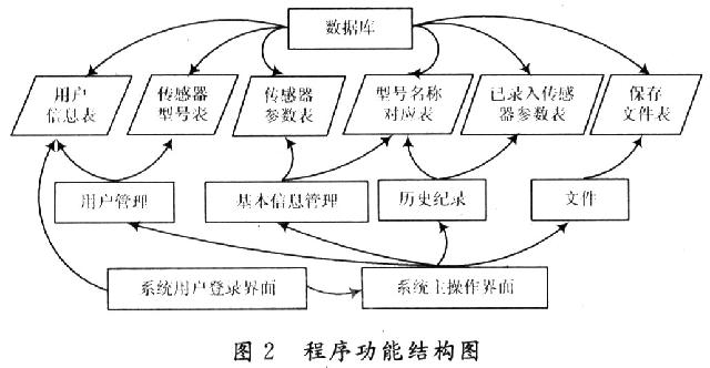 “电子标签管理系统”是以传感器参数为应用对象,结合当前和未来管理的发展需求进行设计的。系统的后台采用目前流行的面向对象编程语言Visual C++6.0开发,并挂接Access数据库。厂家除了可以为每个传感器制作电子标签外,还可以对出厂产品进行信息管理,包括产品的查询、品种的增加、删除,每日或每月的产量统计等。程序主要由用户登录界面、文件、基本信息管理、历史记录、用户管理、数据通信、帮助、退出等模块组成。程序功能结构图如图2所示。