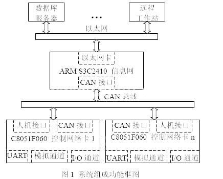 本系统由信息网络层和控制网络层两部分组成。信息网络层是基于S3C2410的ARM系统,运行着TCP/IP协议和现场总线CAN协议;控制网络层是基于C8051F060的控制网络测控系统,它直接与工业测控设备联系,负责测量、调节现场参数,将测量结果通过CAN送给ARM,或是接收ARM下传的数据调控现场设备。论文对CAN总线控制网络和因特网进行了深入研究,提出在提高信息网络协议标准的实时性和兼容性的基础上,从底层设备到远程监控系统都使用统一的协议标准的设计方案,以确保信息准确、快速、完整传输。本方案的优点是价格低廉、功能强大、方便灵活。整个系统的示意图如1所示。
