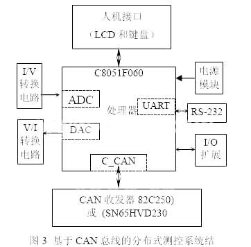 网络测控系统扩展CAN总线模块,要担负至少两个方面的任务:一是支持现场操作,包括数据采集、人-机对话等;二是与上级节点进行数据交互,作为网络测控系统的底层设备,系统结构框图如图3所示。
