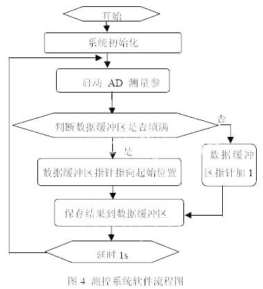 由于被测控的几个量都是缓慢变化的,对测控系统的实时性要求不高。单片机大部分时间在进行参数测量,每次测量结束后使用查询方式将测量结果保存到数据缓冲区中。由于单片机的RAM容量有限(C8051F060具有4K的RAM),使用了数据缓冲区,以保存一定数量的测量结果。缓冲区使用先进先出策略,在保存时先判断缓冲区是否填满,没满时缓冲指针加1,数据保存进下一个单元,填满时使指针指向缓冲区的顶部,数据保存进缓冲区,以前的数据丢掉。本系统的设计重点是CAN通信,因此,在CAN通信时采用了中断方式。整个测控系统部分的软件流程图如图4。