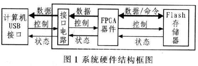 图1为系统硬件结构框图,计算机通过USB接口控制可编程逻辑器件FPGA实现对Flash存储器的块擦除、页编程、读数据等操作。