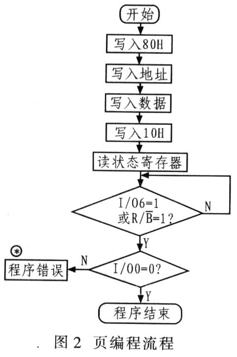 读操作较为复杂,需要XC2S50和CY7C68013协同工作。这里只给出读信号的操作过程。先写人读设置命令00H,因为读一次执行一页,所以地址的写入是2个行地址和3个列地址,之后写入读命令,在等待rb变高后就可发送re信号将数据从Flash读出。写操作过程与读操作类似,但写操作完全由 XC2S50控制,写完命令、地址后,开始写入数据,直到写满2 KB数据,最后输入页编程命令。需要注意每写完2 KB数据,Flash返回的状态信号rb所等待的时间较长,大约是140μs。图2为页编程的流程。