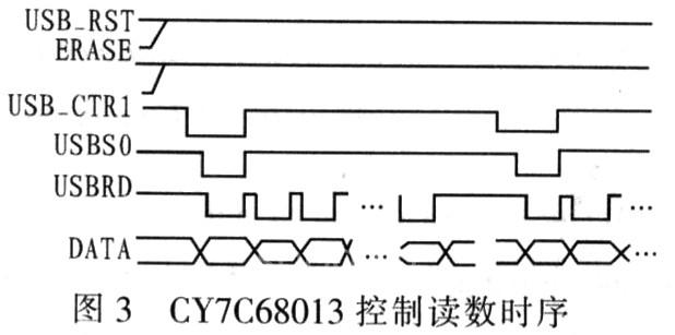CY7C68013主要完成两部分工作,一是实现对擦除的控制开关命令,即上位机通过USB接口发送擦除命令,CY7C68013接收到这个命令后,会发送一个约为200 ms低脉冲通知FPGA启动擦除操作;二是通过与FPGA配合,完成从Flash通过CY7C68013的GPIF接口读入上位机的任务。 CY7C68013所用到的I/O包括控制线USBCTR1,状态线US-BS0,读信号线USBRD及8条数据线。
