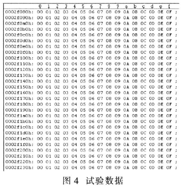 为验证系统可靠性,在数据输入端循环输入00~0F递增数据,通过上位机读出、写入Flash中的数据,图4为试验数据。通过读出的数据验证了该系统数据存储及回读的正确性、可靠性。