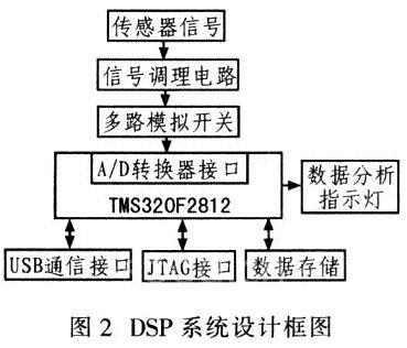 DSP实时震动信号分析和处理系统主要由震动传感器、前置放大电路、滤波电路、DSP数据采集分析模块以及存储模块组成。图2为系统设计框图。