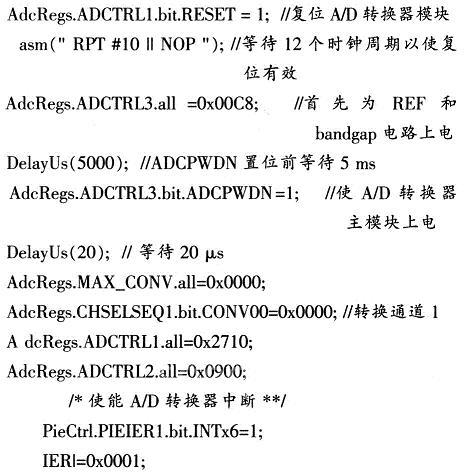 EVA为SEQ1产生ADC SOC信号后,开始对通道1转换,转换结束后,A/D转换产生中断信号并调用中断处理程序读取ADCRESULTO中的值存人数组。当采满512个点后将程序跳转到数据处理程序,调用FIR和FFT子程序,其中DSP A/D转换器初始化程序代码为: