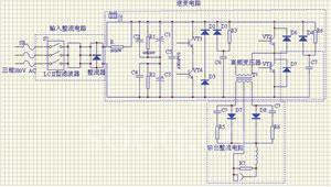输入整流滤波电路包括:熔断器SR、三相转换开关K、三相桥整流器D0、合闸浪涌限制电路(主回路软启动电路)及滤波电路。主回路软启动电路的作用是为了防止在合闸瞬间造成:(1)电源开关接点熔断;(2)输入保险丝熔断;(3)对其他相邻电路产生干扰;(4)恶化电容器和整流器的性能。