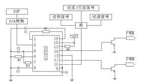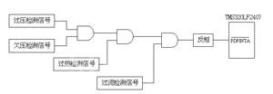 TMS320LF2407提供了PDPINTA输入信号,可保证系统中功率转换电路及逆变电路的安全可靠工作。保护电路结构框图如图6所示。过压/欠压检测信号、过流检测信号、过热检测信号经或门综合后,经过反相输入到PDPINTA引脚。若有故障时,或门输出为高电平,该引脚相应为低电平, DSP的PWM输出管脚全部成高阻状态,PWM输出被封锁。整个过程可由硬件实现。