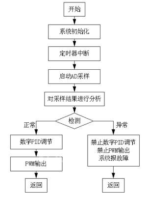 控制系统的软件主要包括系统初始化程序、ADC采样程序、PWM波生成程序、PID控制算法程序等。软件总体设计流程如图7所示。