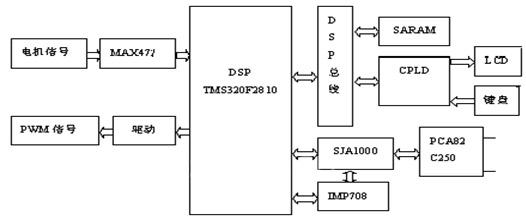 系统的控制节点硬件结构如图2所示,可以同时测试四个电机。硬件部分主要包括:电机的电流和输出脉冲(OP)信号采集和信号调理电路、PWM输出电路、复位上电电路、组合逻辑电路CPLD,CAN通信和键盘显示接口等部分。其中DSP采用的是TI公司的高集成高性能DSP芯片TMS320F2810。CAN通信部分采用了PHILIPHIS公司的集成CAN控制芯片SJA1000(CAN总线控制器)和PCA82C250(CAN总线收发器),系统中设置CAN总线的最大传输量为500Kb/s,且晶振频率定为16MHZ,CAN总线系统任意两个节点之间的最大距离为130M,此时总线定时BTR0值为00H,BTR1值定为1CH。当IMP708复位上电时, F2810控制器通过通用I/O(GPIO)口给电机加电,同时通过F2810片内的PWM模块输出占空比可调的矩形波信号控制电机的转速。电机的电流信号和输出脉冲信号经过信号调理芯片MAX472进入到F2810的片内A/D转换器,转换成数字信号供DSP处理。DSP计算出来的电流和转速值显示在液晶显示器上,同时通过CAN总线传送到上位PC机。各个节点通过键盘可以输入测试参数,包括PWM信号的占空比、转速和电流的上下限参数等,也可以通过CAN总线由上位PC机设置。