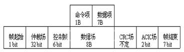 CAN遵从OSI层模型,按照OSI标准模型,CAN结构划分为两层:数据链路层和物理层,它们由CAN控制器的硬件实现电平变换和帧的封装。CAN网络中包括4种不同类型的帧。其中,数据帧将数据由发送器传至接收器;远程帧由节点发送以请求具有相同ID标志符的数据帧;出错帧可由任何节点发送,以控制总线错误;而超载帧用于提供先前和后续数据帧或远程帧之间的附加延时。另外,数据帧和远程帧以帧空间同先前帧隔开。在实际应用中,还需要建立自己的上层协议。在本系统设计中,采用简单实用的“命令项加数据项”结构[3],其完整数据帧结构如图5所示。考虑到工在业控制中,功能一般不多,因此命令项的长度设定为1B(可描述128种命令)。而在本控制系统中,命令所需参数一般不会大于7B,故数据项长度直接设为7B。