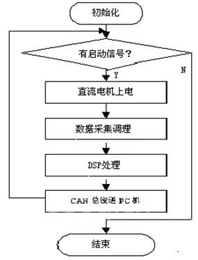 系统的CAN应用节点部分采用的是BasicCAN程序,它包含初始化子程序、发送子程序、接收子程序三个部分。DSP软件编写采用的是TI公司的DSP集成开发环境CCS2000,它支持汇编语言和C语言编程。为了保证程序运行效率,核心算法FFT程序和中断向量表程序采用汇编语言编写,而其它程序都采用C语言编写,使本系统软件具有模块化、结构化、可移植性好和调试方便的特点。系统的软件执行过程是:首先是系统初始化工作,即设置寄存器、配置GPIO、定时器、A/D转换器和外部中断、启动A/D转换。然后检测GPIO有没有启动信号,检测到启动信号后,从另一个GPIO发出控制信号给直流电机加电。从A/D转换器里读取电流信号数据,再通过求平均值得到电机的电流值;对输出脉冲信号的数据进行FFT变换,求出基波的频率,再根据电机的具体型号乘以一个系数得到电机的转速。最后把测试电流和转速送给LCD显示,启动CAN总线传输,把测试结果传输到上位PC机,以对数据进行保存和分析。软件流程如图4所示。
