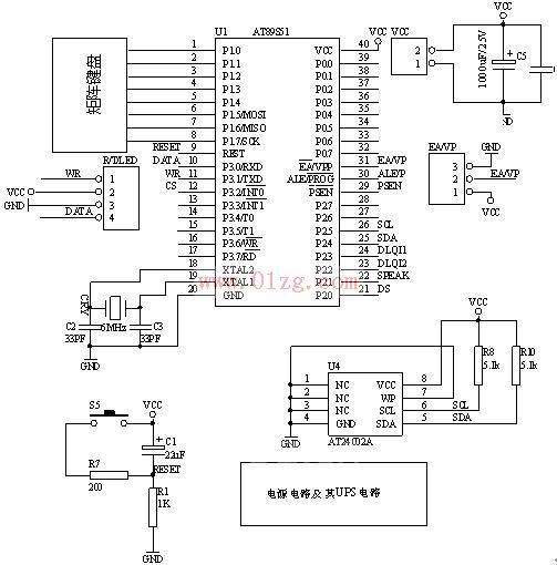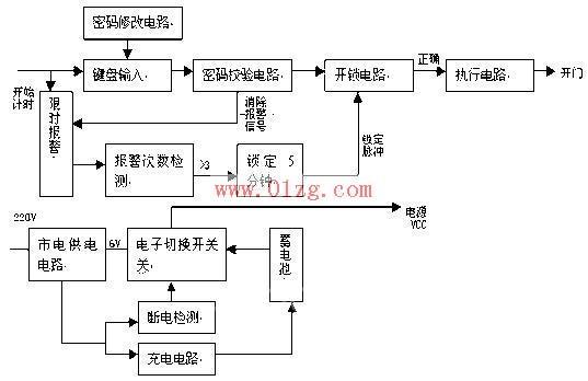 电路由两大部分组成:密码锁电路和备用电源(UPS),其中设置UPS电源是为了防止因为停电造成的密码锁电路失效,使用户免遭麻烦。
