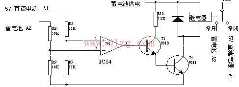 由R8,R9,R6,R7及IC14构成电压比较器,正常情况下,V+<V- IC14输出高电平,继电器的常闭触点和市电相连;当市电断开,V+>V- IC14输出高电平,由T3,T4构成的达林顿管使继电器J开启,将其常开触电将蓄电池和电路相连,实现市电和蓄电池供电的切换,保证电子密码锁的正常工作(视电池容量而定持续时间)。其电路图如下图6所示: