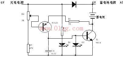 T1,T2构成的蓄电池自动充电电路,它在电池充满后自动停止充电,其中D1亮为正在充电,D2为工作指示。由R4,R5,T1构成电压检测电路,蓄电池电压低,则T1,T2导通,实现对其充电;充满后,T1,T2截止,停止充电,同时D1熄灭,电路中C4的作用是滤除干扰信号。其电路图如图7所示: