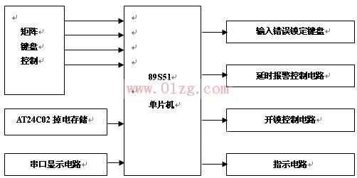 方案二:采用一种是用以AT89S51为核心的单片机控制方案。利用单片机灵活的编程设计和丰富的IO端口,及其控制的准确性,不但能实现基本的密码锁功能,还能添加调电存储、声光提示甚至添加遥控控制功能。其原理如图1-2所示。