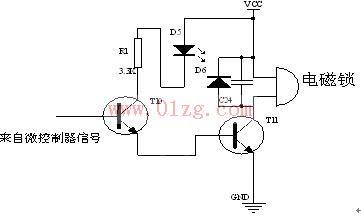 电路驱动和开锁两级组成。由D5、R1、T10组成驱动电路,其中T10可以选择普通的小功率三极管如9014、9018都可以满足要求。D5作为开锁的提示;由D6、C24、T11组成。其中D6、C24是为了消除电磁锁可能产生的反向高电压以及可能产生的电磁干扰。T11可选用中功率的三极管如8050,电磁锁的选用要视情况而定,但是吸合力要足够且由一定的余量。