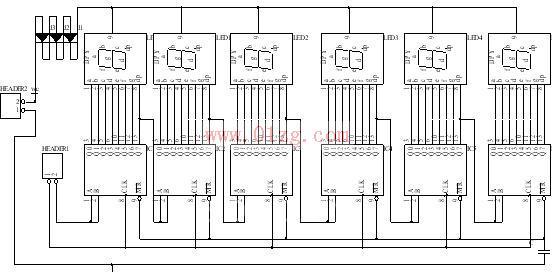 从单片机串口输出的信号先送到左边的移位寄存器(74HC164),由于移位脉冲的作用,使数据向右移,达到显示的目的。移位寄存器74HC164还兼作数码管的驱动,插头1(header1)接电源,插头2(header2)接数据和脉冲输出端。电路中的三个整流管D1~D3的作用是降低数码管的工作电压,增加其使用寿命。