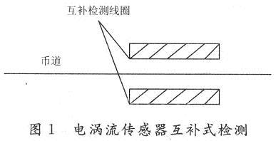 在本硬币识别器中,采用探头式线圈,由于硬币在币道中滚动时,其在径向位置会产生微小的抖动,为了消除这种抖动带来的影响,在币道两边都安装有检测线圈,进行探头互补式检测。如图1所示。