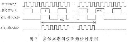 CT1的闸门开放时间完全与fx的m个周期同步。闸门开放时间T1=mtx。在fx的第一个上升沿和第m+1个上升沿之间的mtx时间间隔内,允许CT2对fr计数,计数值记为N。上述测频的时序图如图7所示。